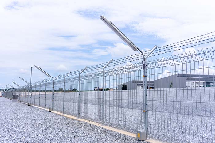 施設の周囲に高強度のフェンスや有刺鉄線を設置し、不審者の侵入を防ぎます。